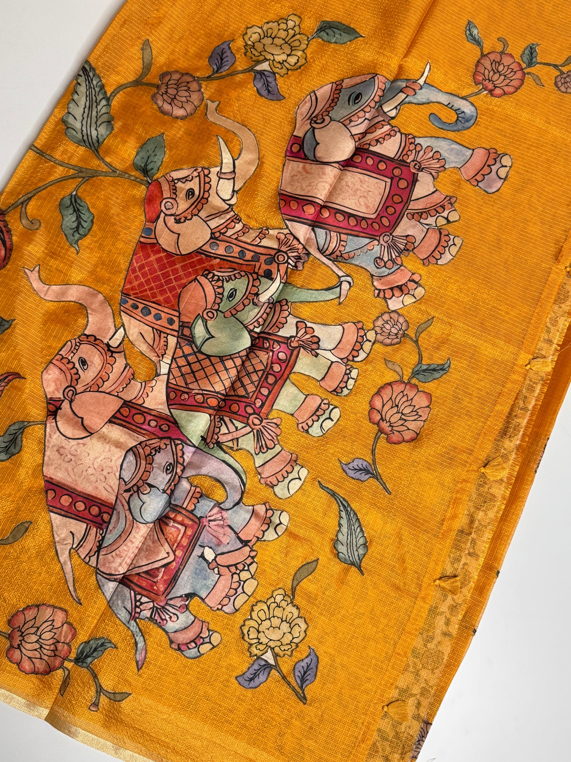 Crafted in lightweight Kota silk, this saree is adorned with intricate appliqué work that adds a touch of elegance and richness. The delicate detailing enhances its graceful charm, making it perfect for both casual gatherings and festive occasions. Known for its airy texture, Kota silk ensures comfort and ease of draping, allowing you to carry it effortlessly throughout the day. A blend of tradition and style, this saree is a timeless addition to your wardrobe. Attached with floral Printed Blouse.