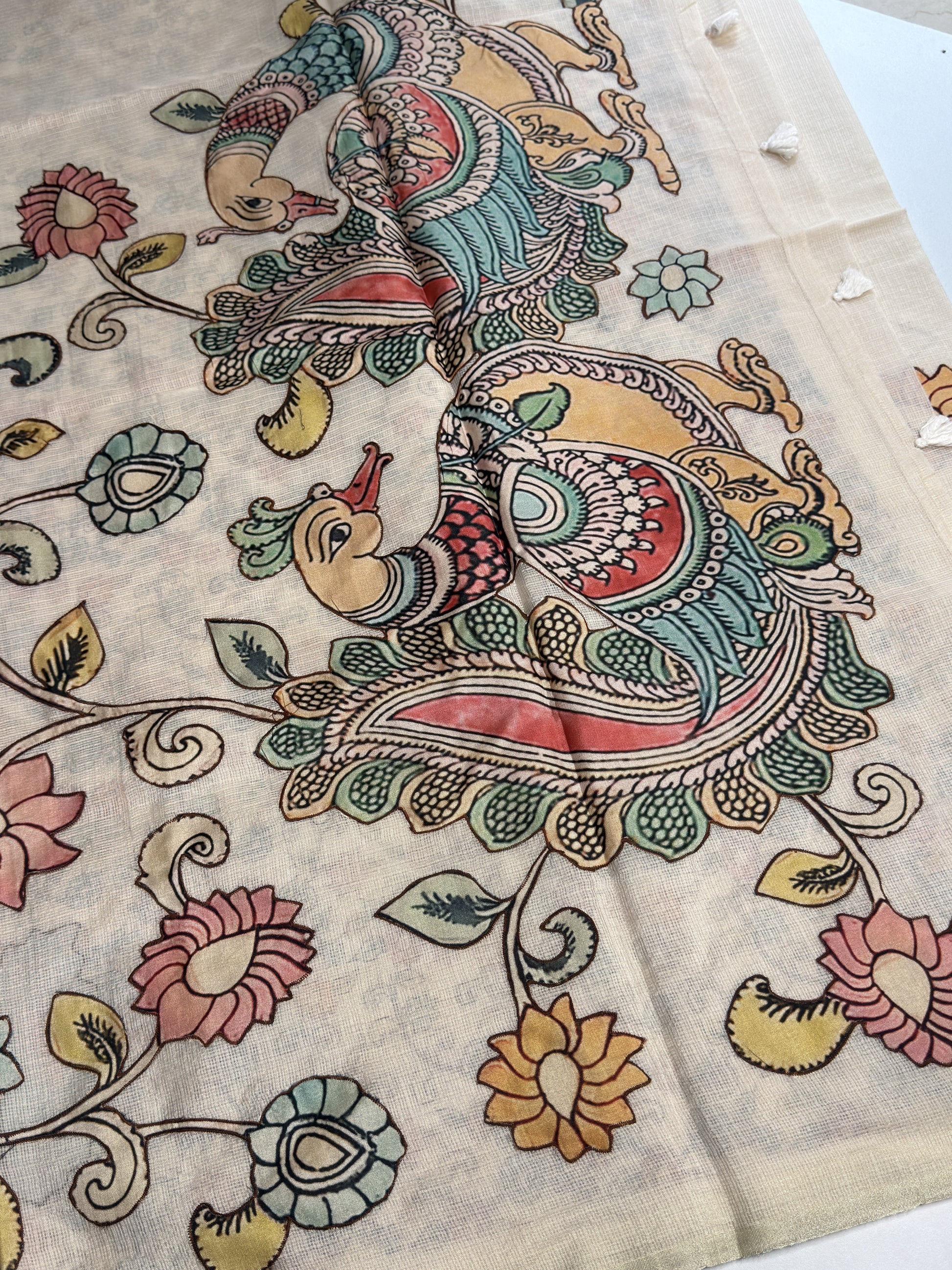 Crafted in lightweight Kota silk, this saree is adorned with intricate appliqué work that adds a touch of elegance and richness. The delicate detailing enhances its graceful charm, making it perfect for both casual gatherings and festive occasions. Known for its airy texture, Kota silk ensures comfort and ease of draping, allowing you to carry it effortlessly throughout the day. A blend of tradition and style, this saree is a timeless addition to your wardrobe. Attached with floral Printed Blouse.