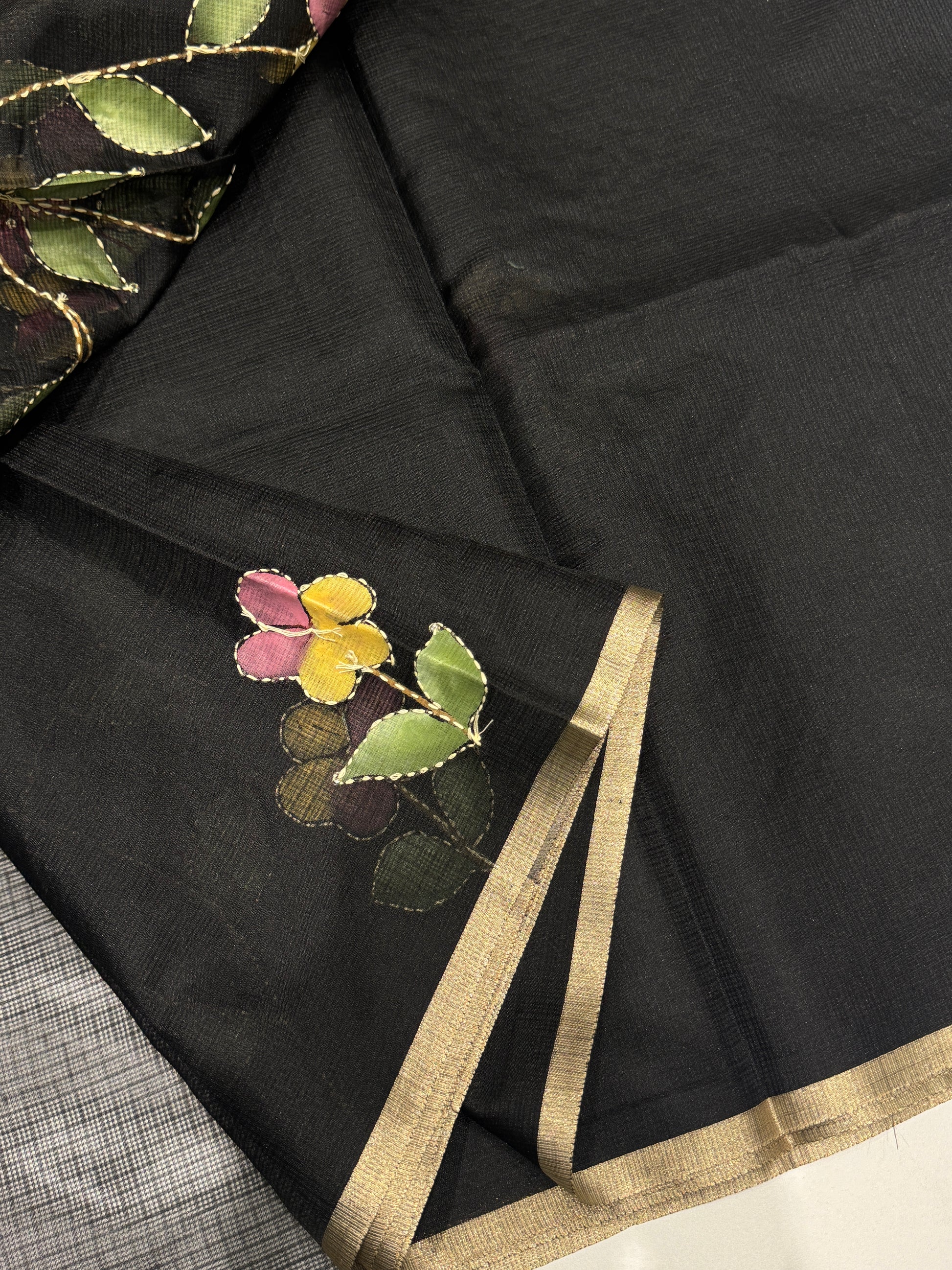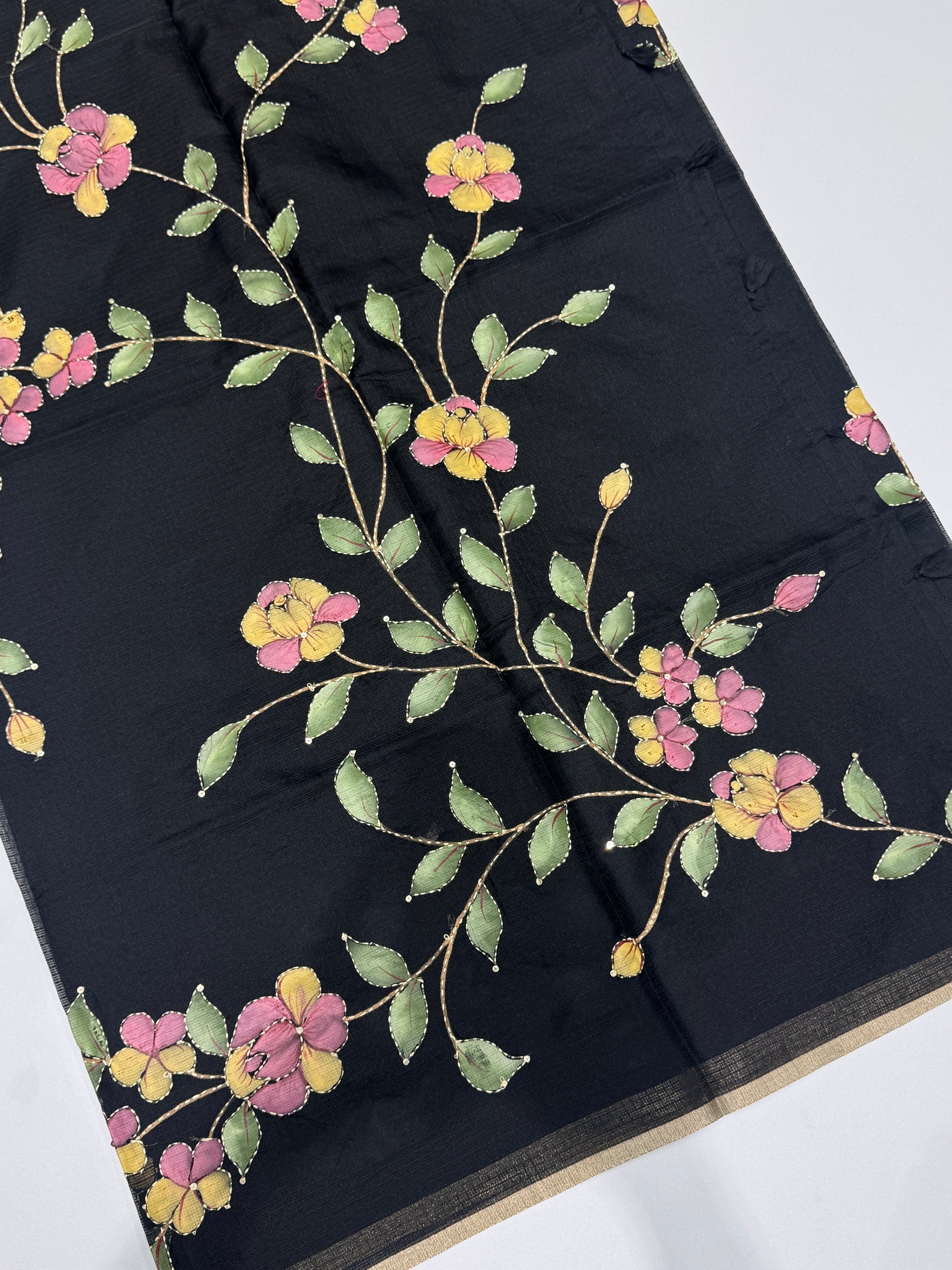 This exquisite hand-painted Kota silk saree is a true work of art, blending tradition with elegance. Adorned with delicate hand painting, the drape is further enhanced with intricate Kantha stitch detailing and a subtle touch of sequin work, adding a graceful shimmer. Lightweight and airy, the saree flows effortlessly, making it perfect for special occasions. The set comes with a matching blouse piece, beautifully designed with a hand-painted motif on the sleeves, completing the artistic charm.
