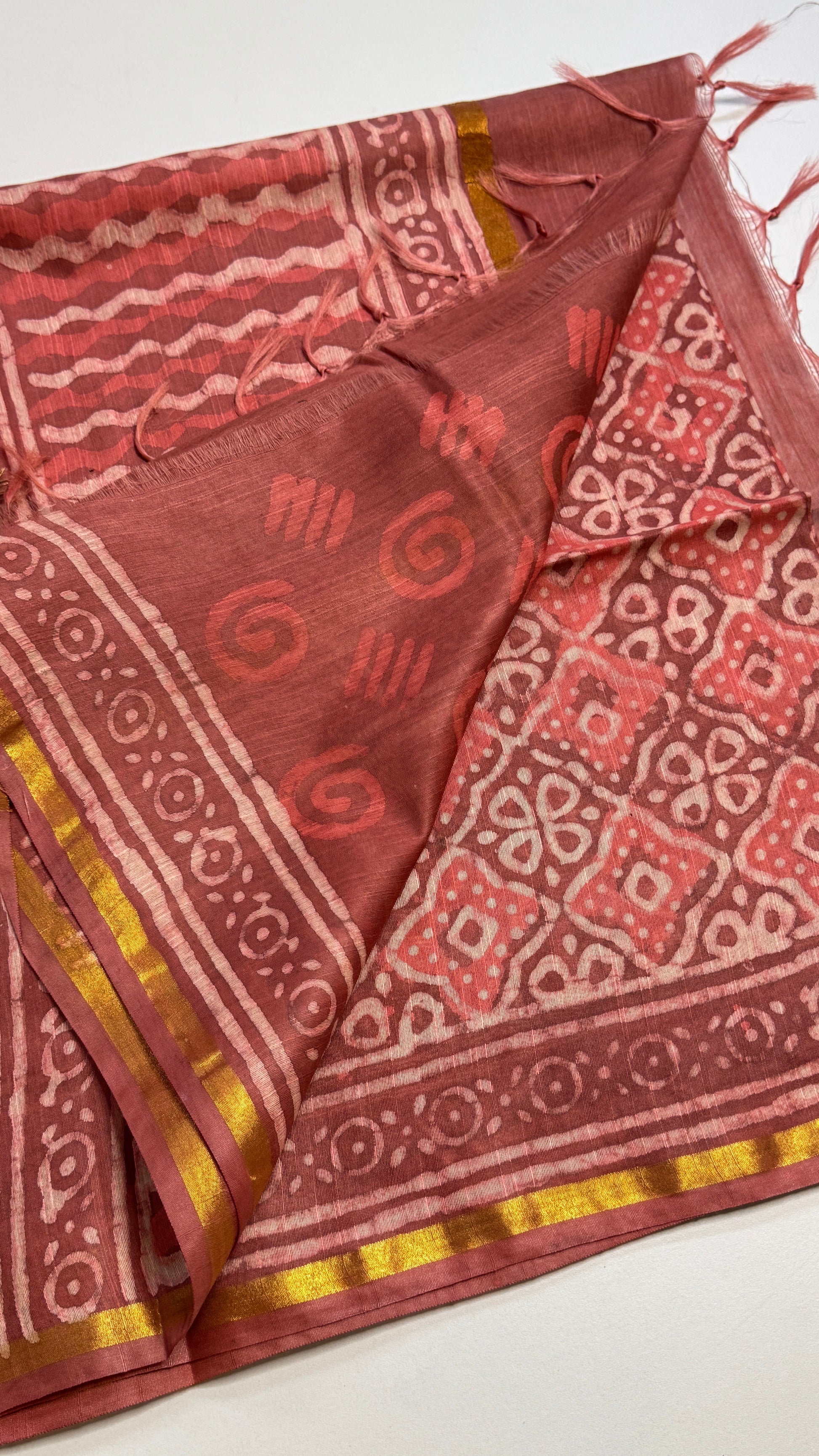 Mul Chanderi Dabu Printed Saree with Thin Zari, attached with printed blouse.