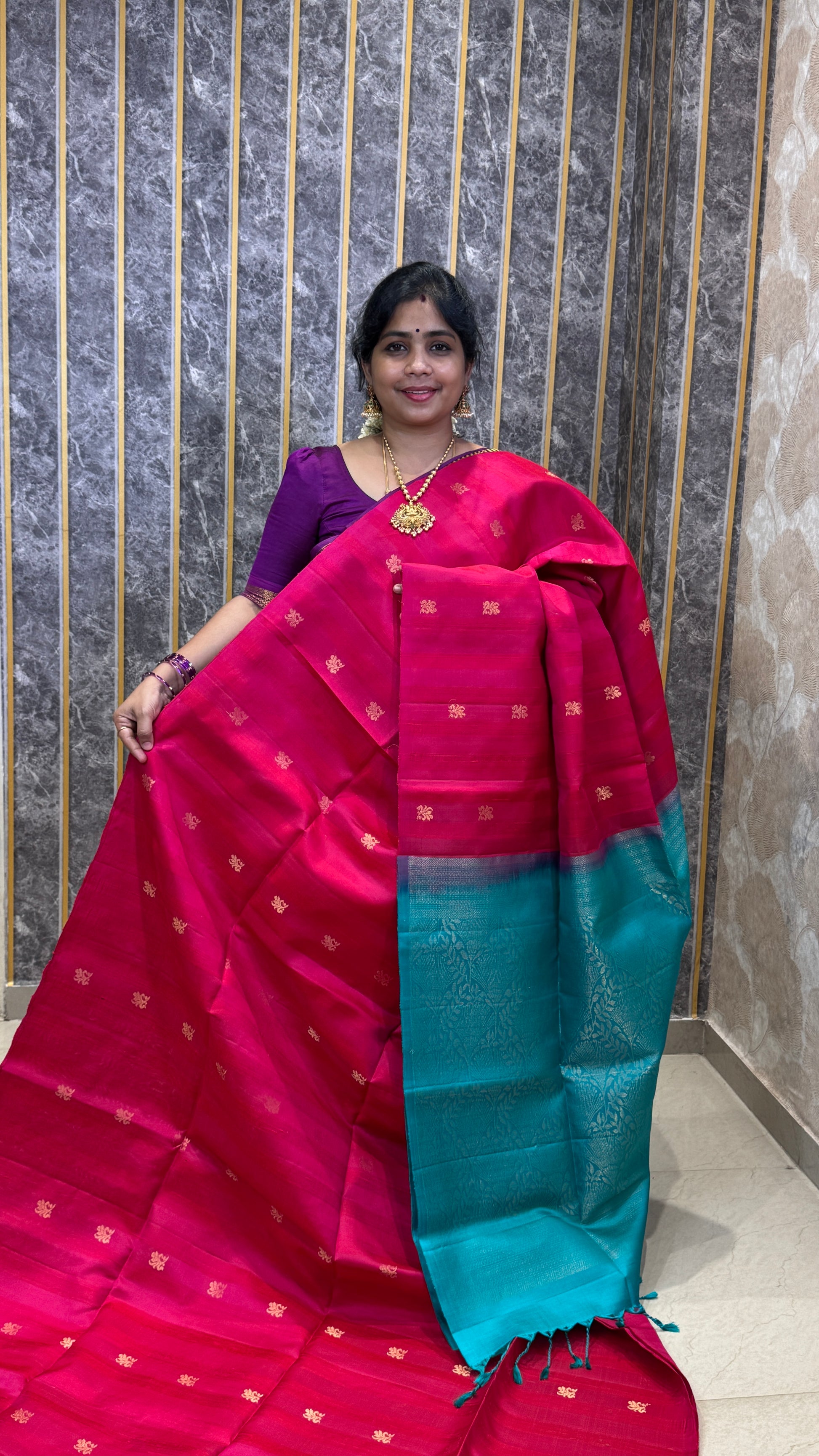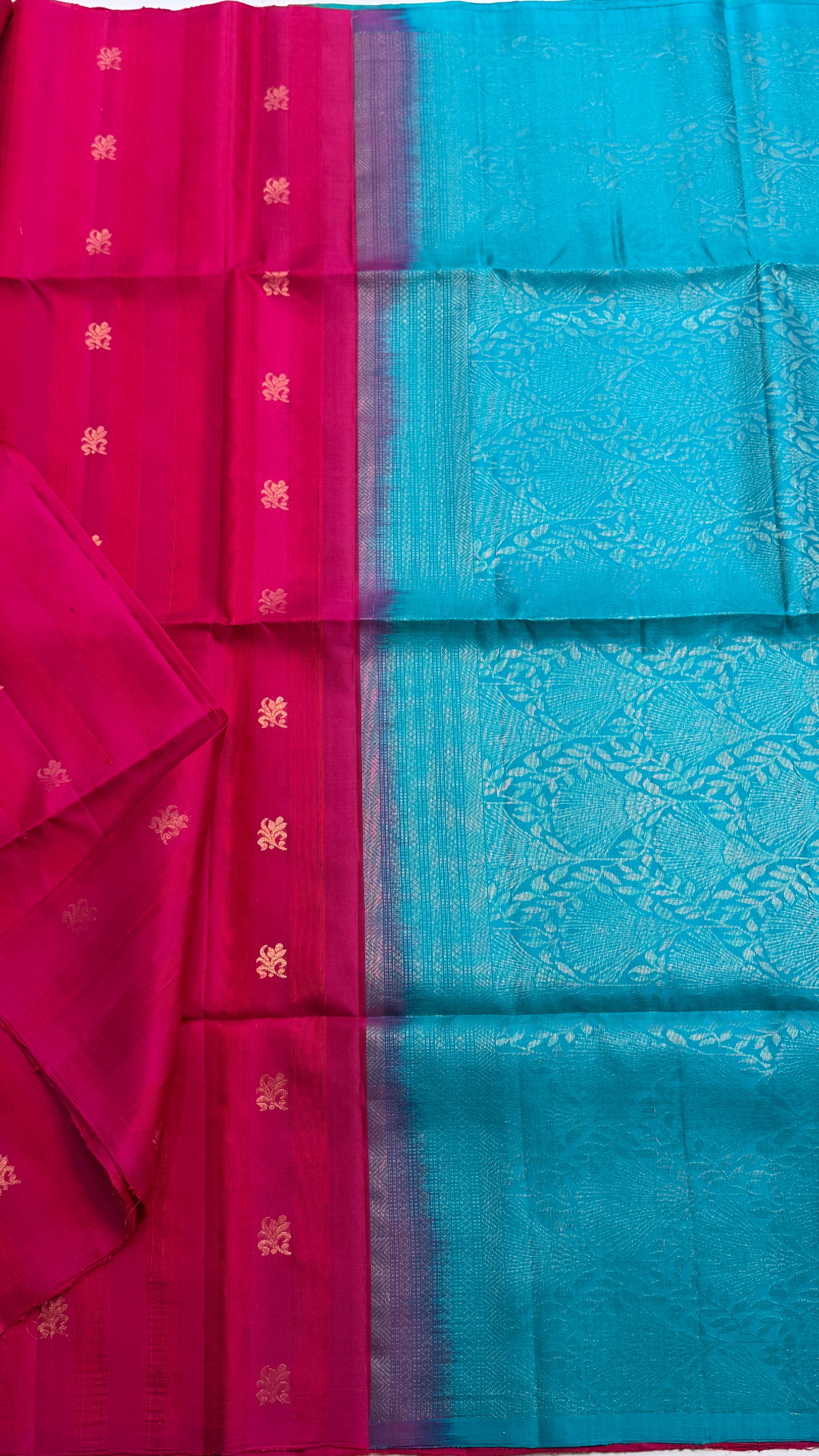 Handloom Jute Silk Saree with floral zari buttas all over, attached with contrast blouse.