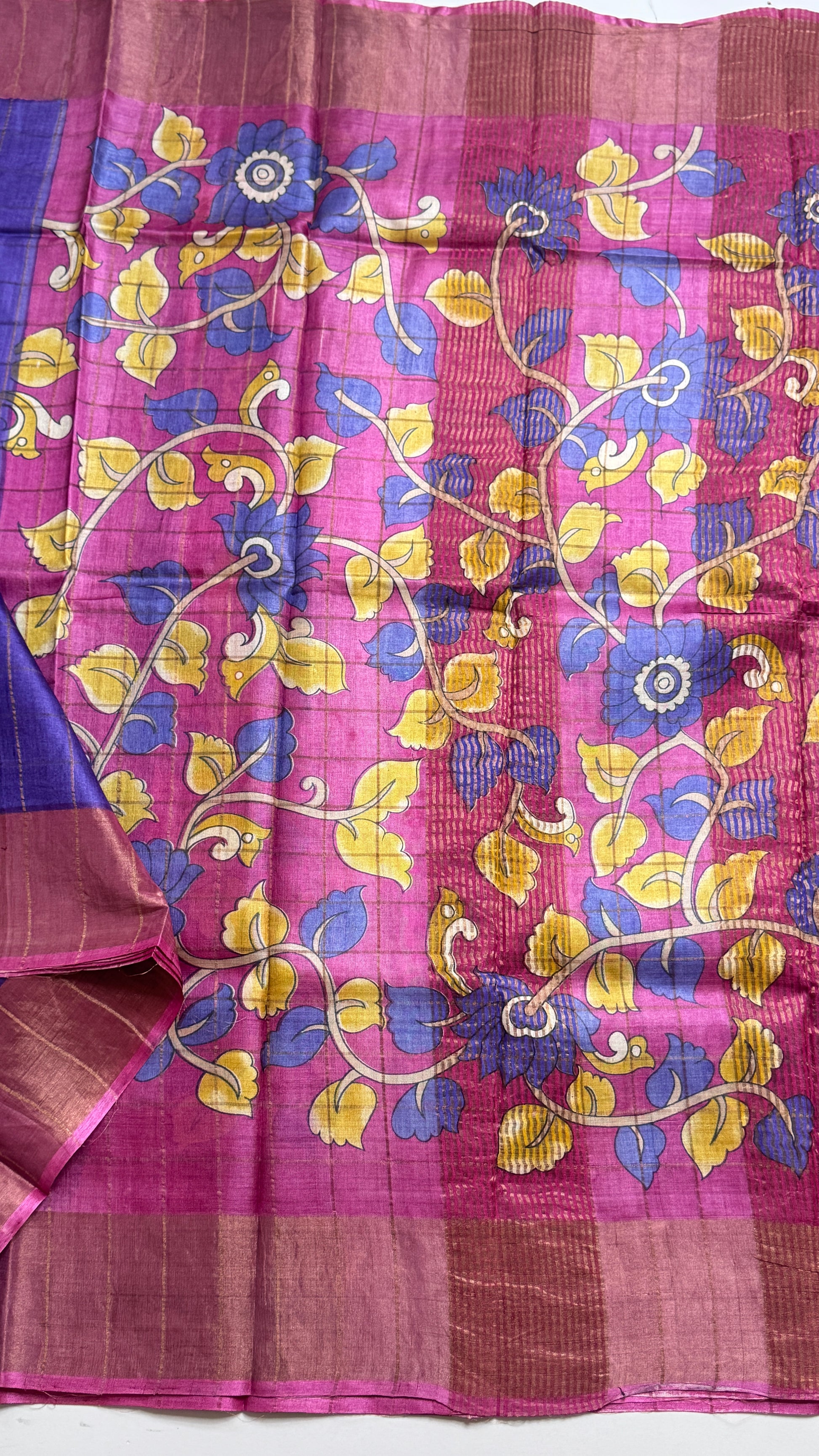 Handloom Pure Tussar Silk Saree with Silk Mark Certified. Pallu and Blouse has got the beautiful Kalamkari Hand painted prints.