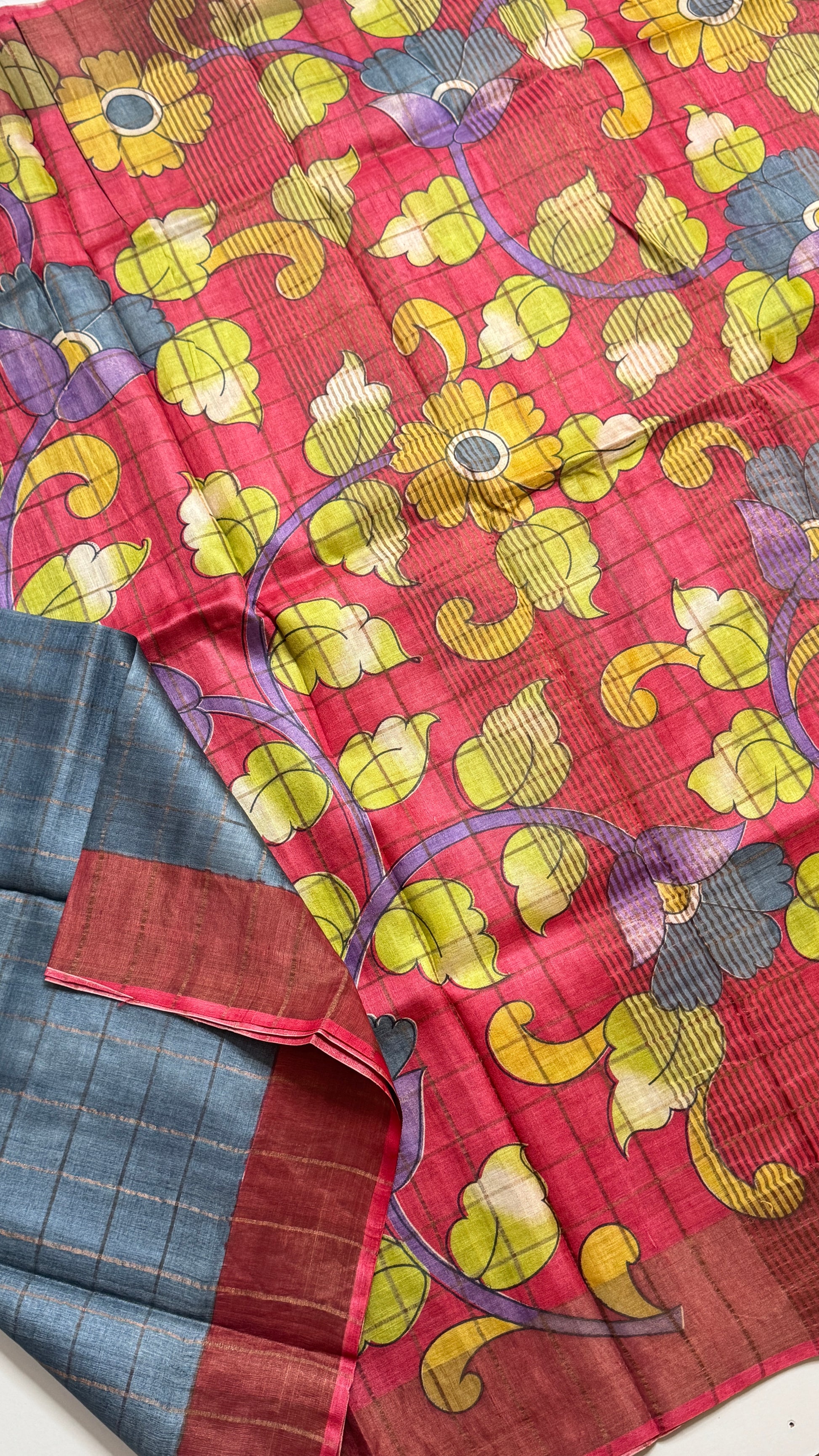 Handloom Pure Tussar Silk Saree with Silk Mark Certified. Pallu and Blouse has got the beautiful Kalamkari Hand painted prints.