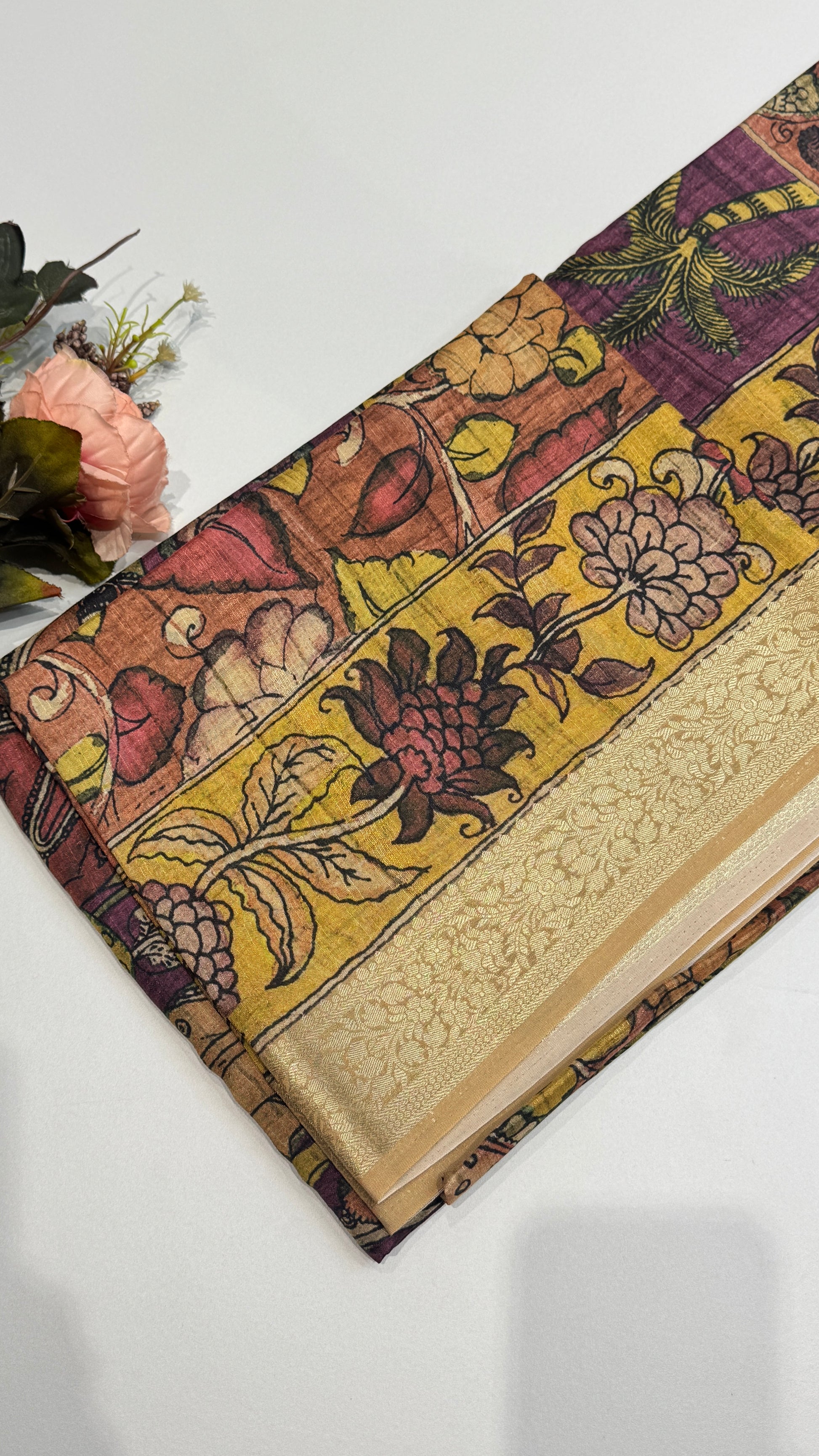 Pen Kalamkari Inspired Printed Semi Tussar Saree with boder. Comes with contrast blouse.