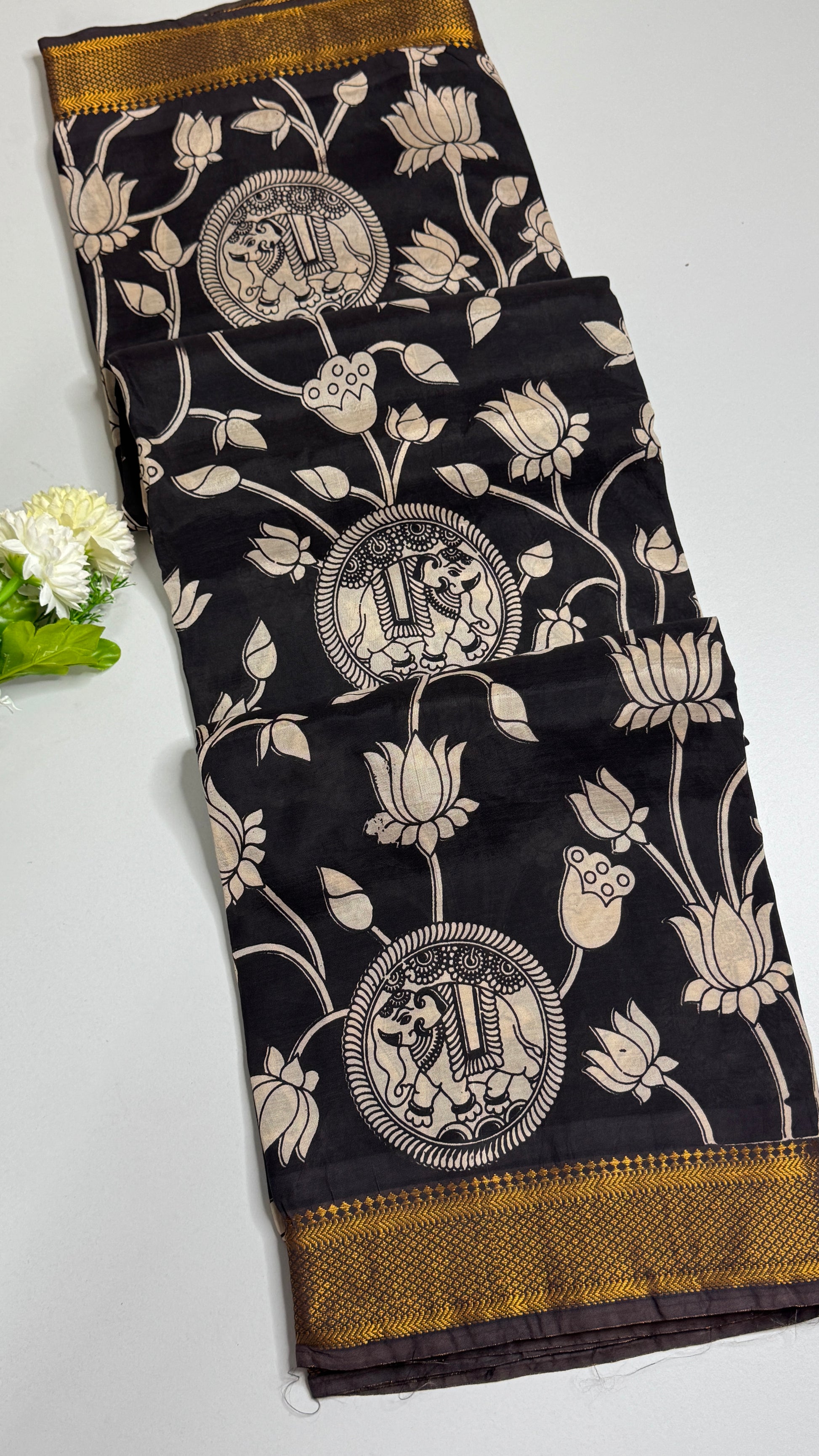 Kalamkari Chennuri Silk Saree with Nizam border. Which includes a stunning Kalamkari blouse piece adorned with beautiful kalamkari prints.