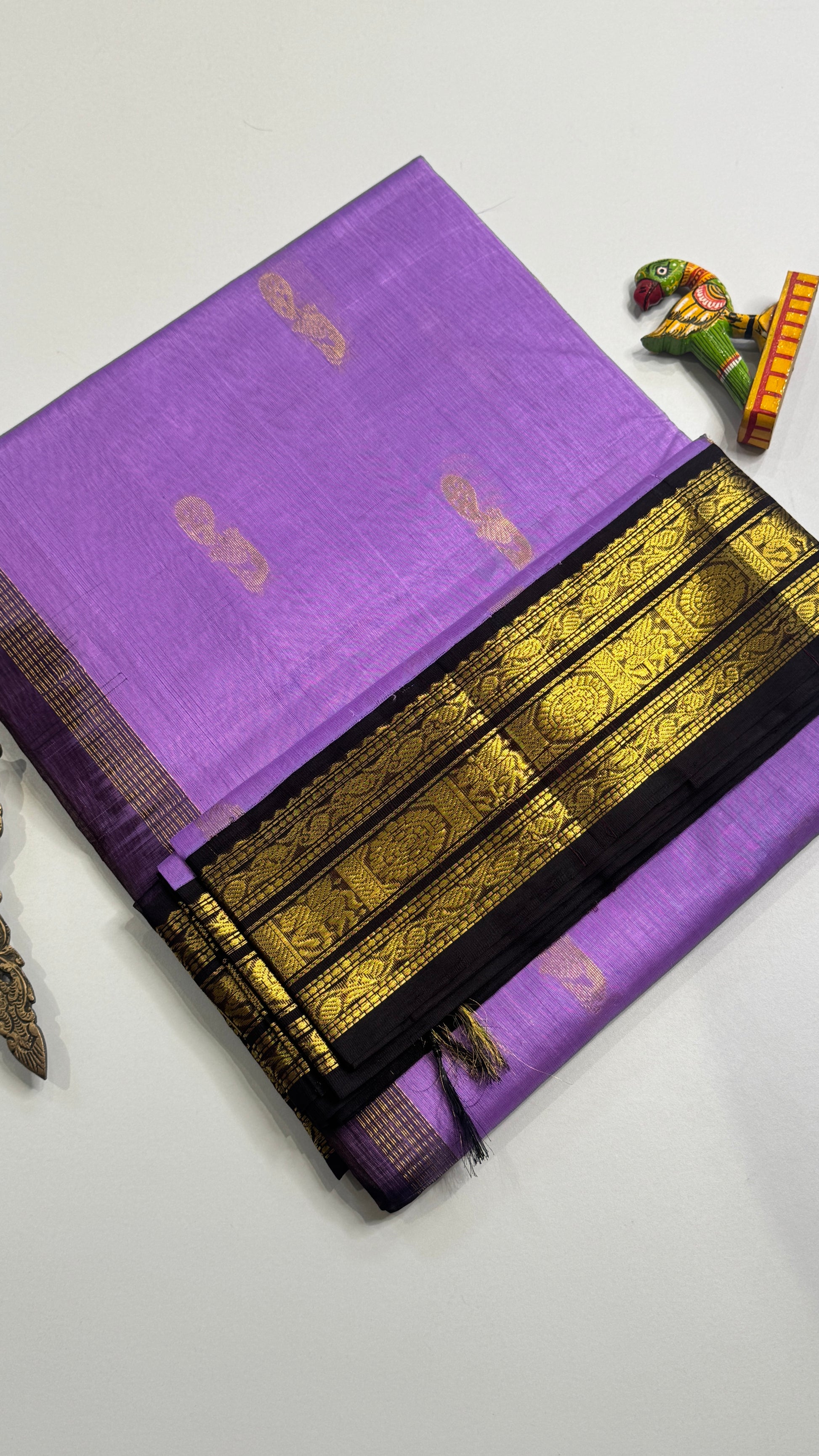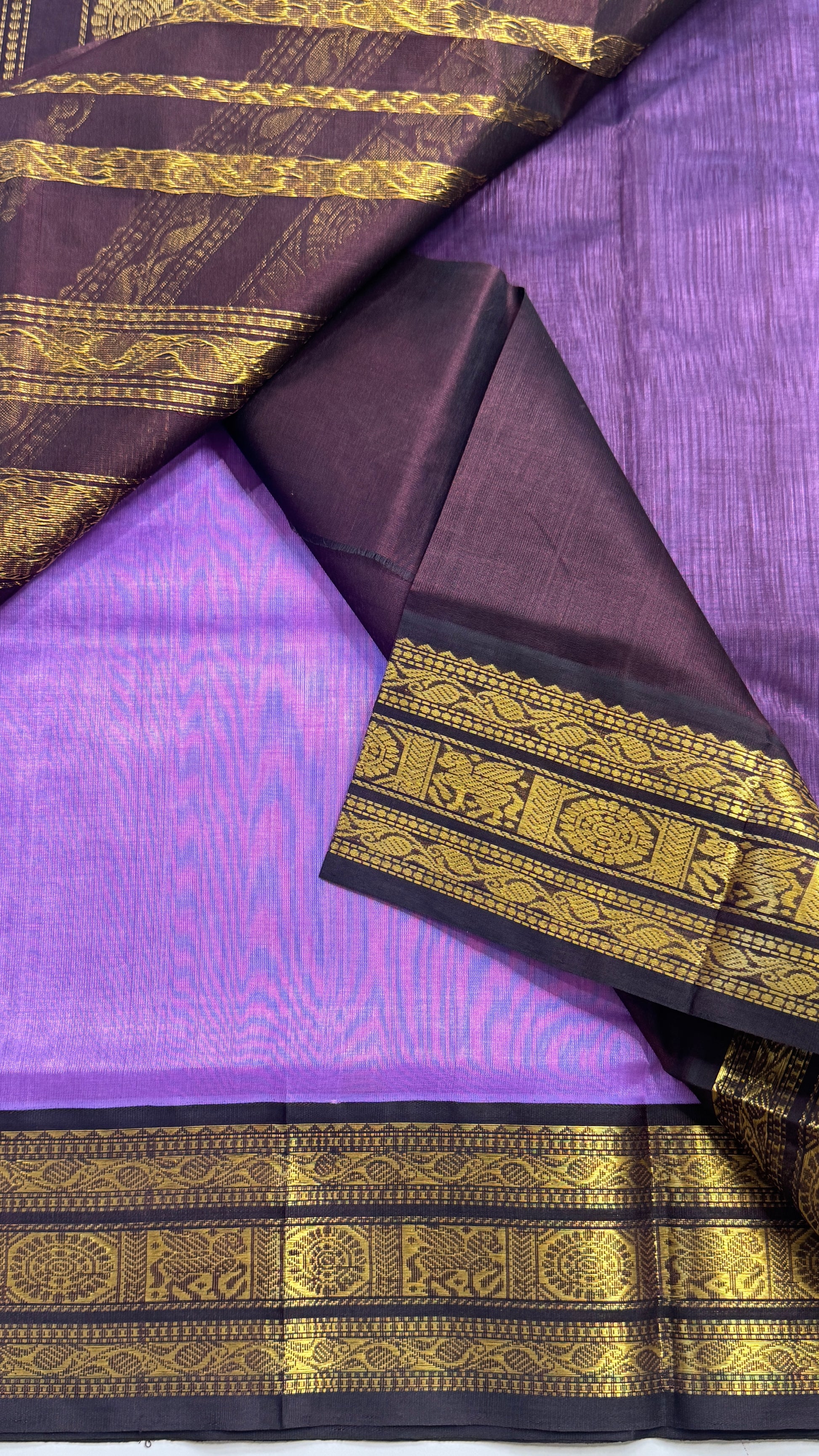 Pure Silk Cotton Saree with Korvai Borders, attached with contrast blouse.