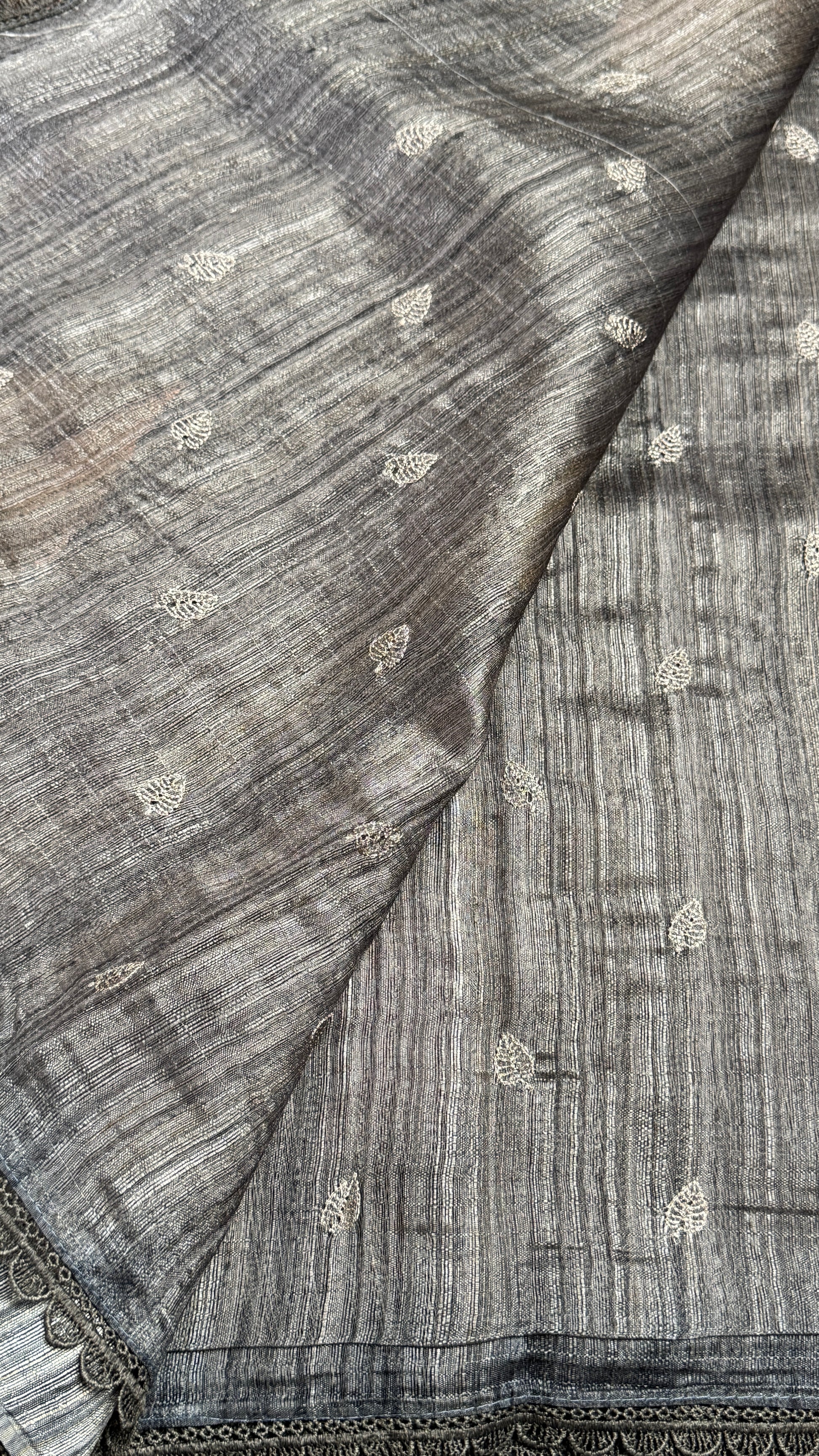 The saree comes with a running blouse featuring delicate thread buttas, perfectly complementing the overall look.