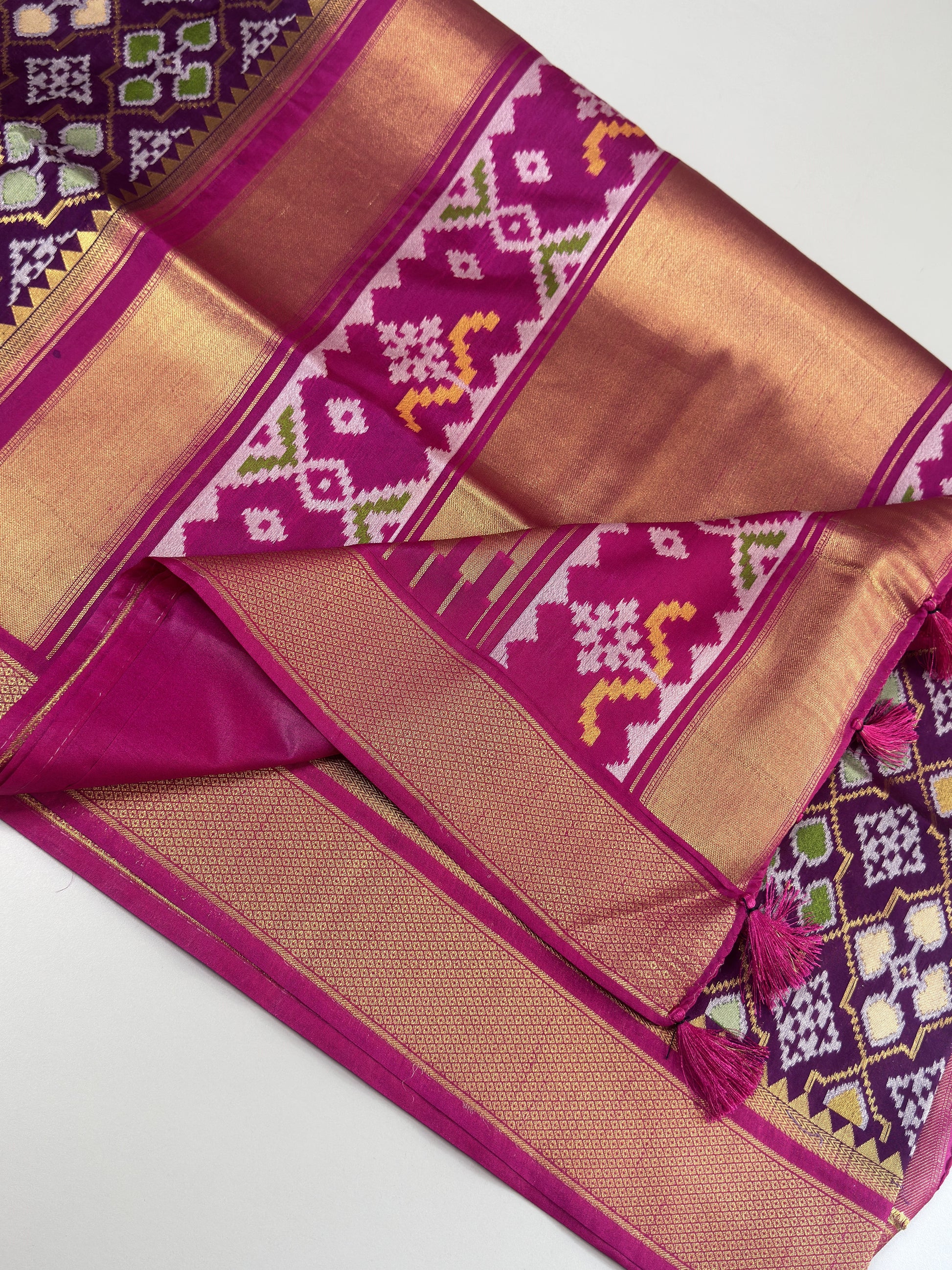 Semi Pochampally style saree adorned with intricate all-over weaving patterns that lend a royal and elegant appeal. The rich contrast border beautifully highlights the body, enhancing its festive charm. Perfect for this Diwali, this saree is crafted from skin-friendly fabric and is light in weight, making it comfortable and easy to drape for long hours of celebration.
